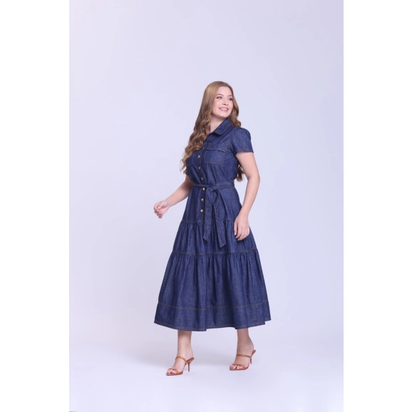 Vestido em jeans leve, decote com gola, fechamento frontal por botões de pressão, bolsos funcionais, mangas curtas e acompanha faixa.