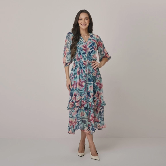 Vestido Cassiane Em Crepe Estampado Azul Tata Martello