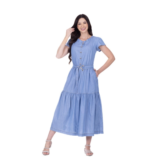 Vestido confeccionado em jeans leve, decote redondo