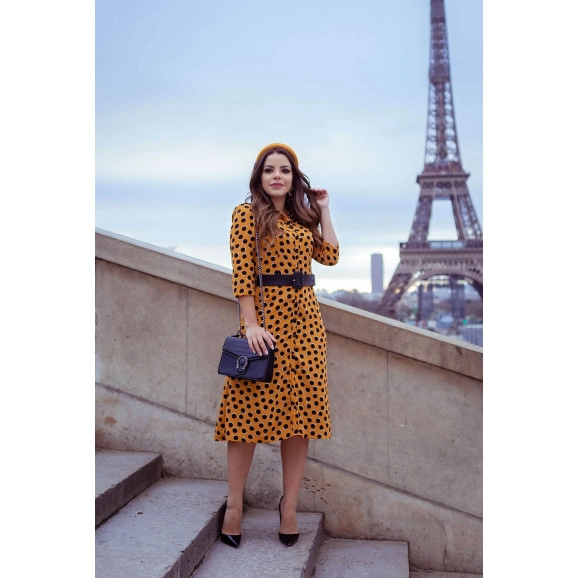 O Vestido Chemise Poá Amarelo Joyaly tem manga 3/4, fechamento em botões frontais. A composição do tecido vestido e forro é 100%poliester. Look super charmoso para você arrasar em qualquer evento que você for! Acompanha Cinto!