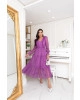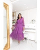 Descrição: Vestido midi fluído, decote v, detalhe em babados no busto, manga longa com lastex no punho, elástico na cintura e saia três marias.