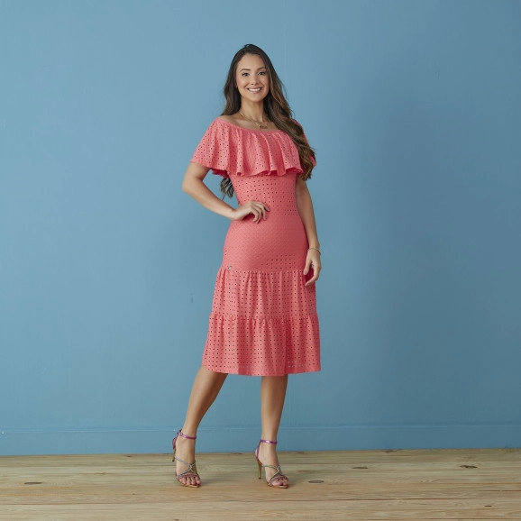 Vestido Tatá Martello, confeccionado na malha laise, forrado, decote ombro a ombro com elástico embutido formando sobreposição com babado. A manga é curta, barra com babado. Composição: 96% Poliester, 4%Elastano. Os melhores vestidos e mais confortaveis você encontra aqui em nosso site!