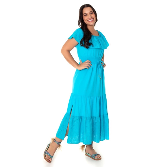 Vestido em mix de tecido sendo plano laise e malha de algodão, elástico interno no decote, babado, lastex na cintura e rolete fixo com ponteiras e possui forro.