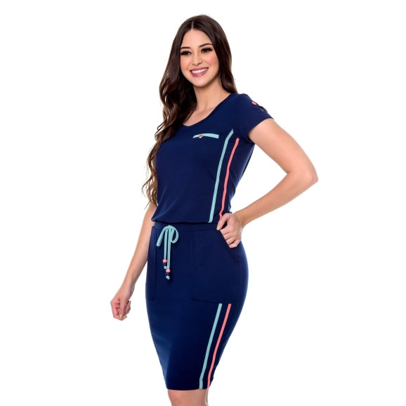 Vestido Azul com Bolso Detalhe Listras Colorida Hapuk