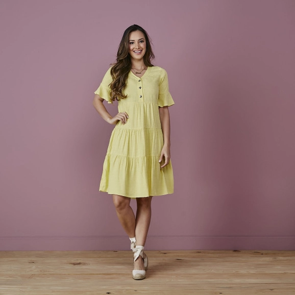 Vestido Tata Martello confeccionado em viscose poá, forrado, botões no busto, gola, mangas alongadas com babado, modelo soltinho. -