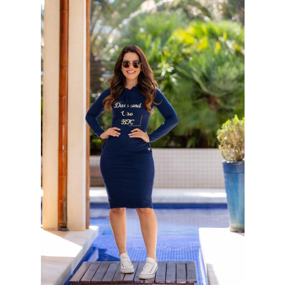Vestido com Capuz Azul Marinho, confeccionado em malha encorpada premium, possui bolsos laterais, estampa exclusiva Boutique K. Composição: 96% Viscose 4% Elastano. Vestido lindo, confortável, daqueles que você não vai querer tirar mais do corpo!