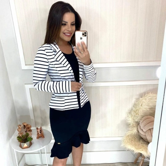 Vestido com Casaco Listrado Branco Maria Amore, vestido manga curta com babado na barra, casaco manga longa listrado fechamento em um botão, detalhe em bolsos falsos. Composição do tecido casaco 95%Viscose 5%Elastano Vestido 90%Poliester 10%Elastano. Vestido super moderno e a cara da estação! Acompanha casaco!