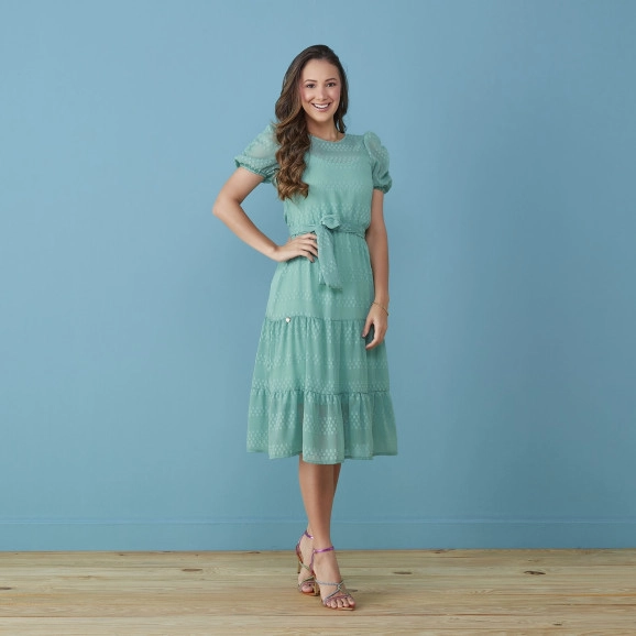 Vestido Tata Martello confeccionado em poliester, manga curta "fofa", saia três marias, evasê com comprimento midi, acompanha faixa de mesmo tecido.