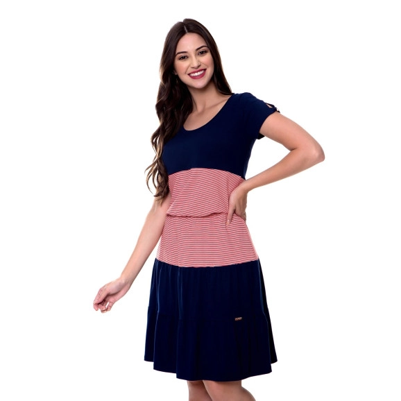 Vestido com Listra Azul-Marinho Hapuk Vestido de malha lisa com recortes de malha listrada. Possui elastiquinho na cintura e detalhe de lacinho nas mangas. Composição: 96%Viscose 4%Elastano. Os vestidos mais confiortáveis e estilosos você só encontra em nosso site! -