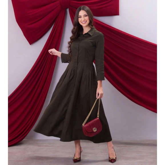 Vestido em tecido plano, decote com gola, fechamento frontal por botões, mangas longas com martingale, bolsos funcionais, elástico interno cintura costas.