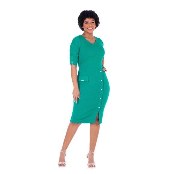 Vestido confeccionado em malha canelada, mangas com pregas, revel falso com botões fixos, lapela frontal, fenda frontal e possui forro.Composição: 100% poliester forro 100% poliester