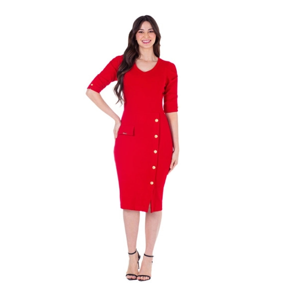 Vestido confeccionado em malha canelada, mangas com pregas, revel falso com botões fixos, lapela frontal, fenda frontal e possui forro.Composição: 100% poliester forro 100% poliester
