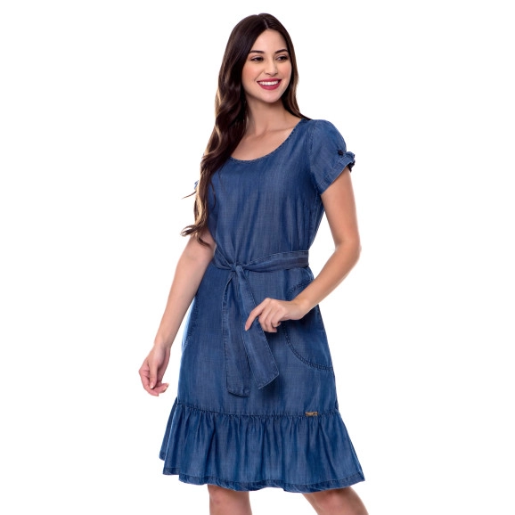 Vestido Dark Denim Hapuk Vestido jeans. Possui modelagem soltinha, bolsos funcionais, elastiquinho nas mangas como detalhe e acompanha faixa para ajuste na cintura.
