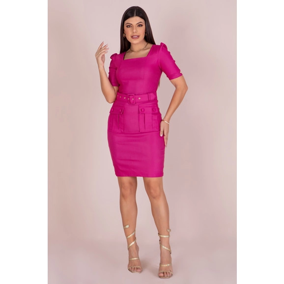 Vestido debengaline com decote quadrado, mangas bufantes, bolso cargo funcional, acompanha cinto encapado.