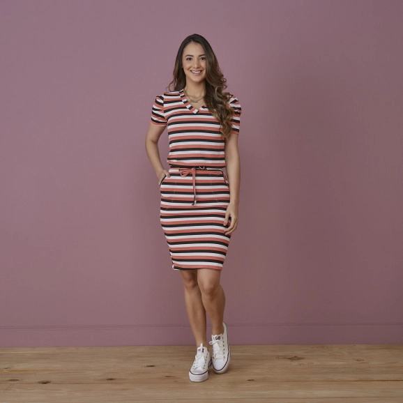 Vestido de Malha Listrada Coral Tatá Martello,Vestido Tata Martello confeccionado na malha listrada ,decote em v, manga curta drapeada, cordão rolete na cintura e bolsos laterais. Composição: