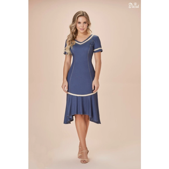 Detalhe: Vestido denin possui detalhe em aplicação, fechamento em zíper atrás. Look super charmoso para você arrasar em qualquer evento que você for!
