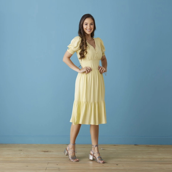 Vestido Detalhe Botões Amarelo Tatá Martello confecionado em tedido viscose, forrado, decote em "V", possui botões "fake" meia pérola dourado, manga "fofa" com punho em lastex, saia com babado. Conta com lastex na parte posterior da cintura para melhor acomodação. Composição: 100% Viscose