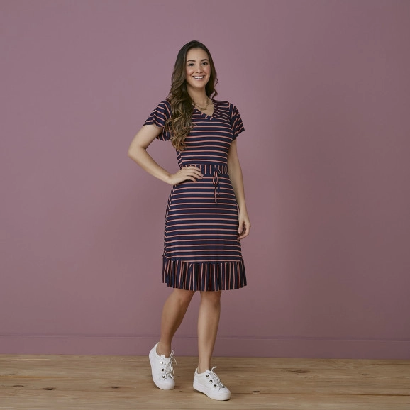 Vestido Tatá Martello confeccionado na malha viscolycra, listrado, forrado, babado na manga e barra, decote em "v", manga curta, detalhe de amarração na cintura. Composição: 72% Viscose 24% Poliéster 4% Elastano. Vestido super confortável, ideal para usar em um passeio em família!