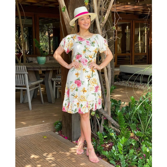 Vestido Tatá Martello confeccionado em viscose, estampado, forrado, modelagem evasê, manga curta com pequena abertura e detalhe de amarração, decote arredondado, botões de pérola (fake), babado na barra. Composição: 100% Viscose. Vestido Lindo, super delicado, ideal para eventos ou culto!