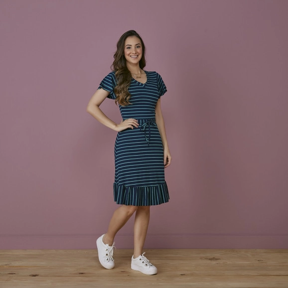 Vestido Tatá Martello confeccionado na malha viscolycra, listrado, forrado, babado na manga e barra, decote em "v", manga curta, detalhe de amarração na cintura. Composição: 72% Viscose 24% Poliéster 4% Elastano. Vestido super confortável, ideal para usar em um passeio em família!
