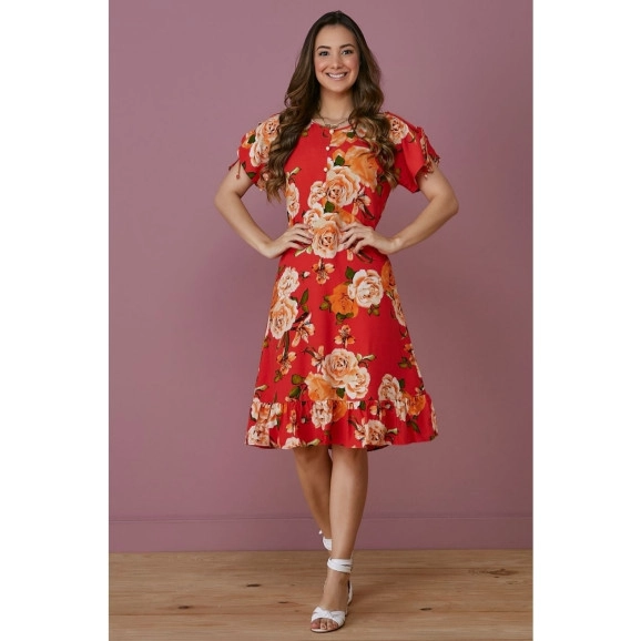 Vestido Tatá Martello confeccionado em viscose, estampado, forrado, modelagem evasê, manga curta com pequena abertura e detalhe de amarração, decote arredondado, botões de pérola (fake), babado na barra. Composição: 100% Viscose. Vestido Lindo, super delicado, ideal para eventos ou culto!