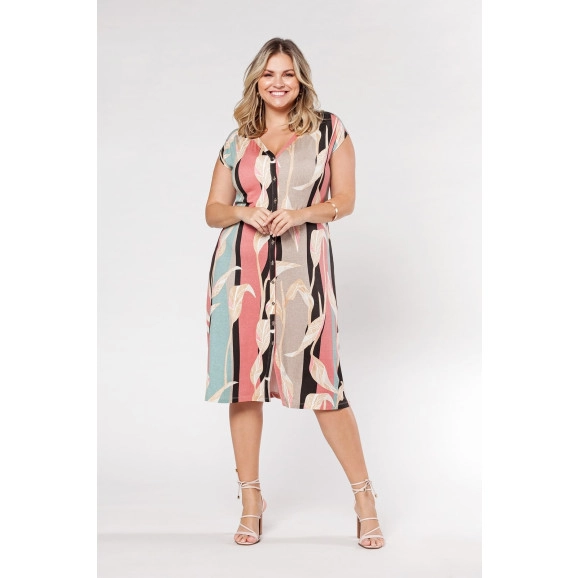 Vestido em viscolycra, possui detalhe em botões, estampa: listras e tropical. Composição: 96% Viscose, 4%Elastano. Para quem não abre mão do conforto, essa é uma ótima opção!