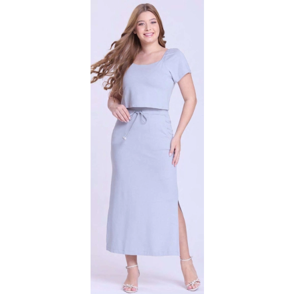 Vestido em moletinho fino, decote redondo, blusa sobreposta fixa, elástico interno nos ombros, canaleta e viés com ponteiras, bolsos funcionais, fendas nas laterais e possui forro.