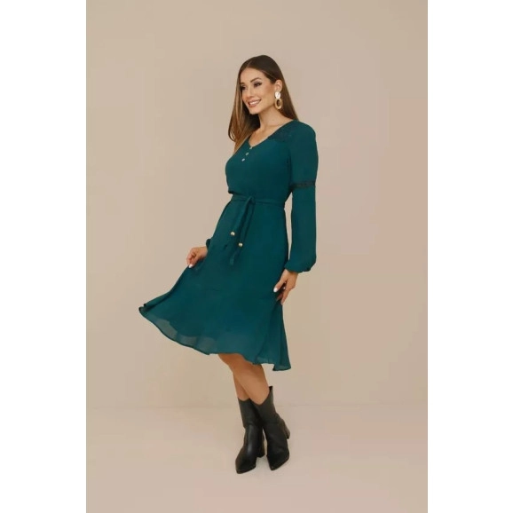 Vestido midi com manga longa, em tecido leve e caimento fluido. Detalhes em renda e acabamento delicado que enriquecem a peça. Modelagem elegante com faixa para ajuste na cintura, valorizando a silhueta.