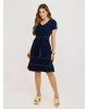 Vestido midi na malha karen com decote em V e recorte na linha princesa possui cintura alongado, recortes marias com babados a fio e manga tradicional. O vestido possui detalhes em bordado manual