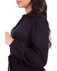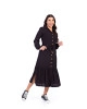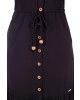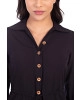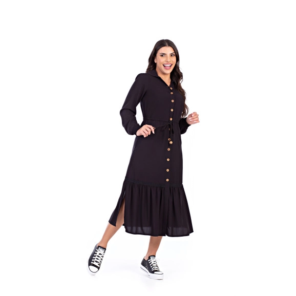 Vestido confeccionado em tecido plano. Decote com gola, mangas longas com punho em lastex, shape solto, fechamento frontal por botões de coco e demadeira, canaleta funcional na linha da cintura com cordão para ajustar, recorte com babado e entre meio e possui fenda nas laterais. Possui forro saiote.