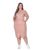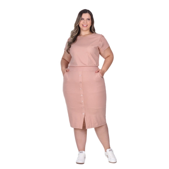VVestido confeccionado em malha texturizada e canelada, decote redondo, ombro com detalhe em pregas, cintura com ribana e elástico interno, bolsos funcionais, botões fixos, fenda frontal e possui forro.