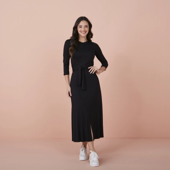 AQUELE BÁSICO NADA BÁSICO. UM VESTIDO ELEGANTE, E CONFY AO MESMO TEMPO. COMPRIMENTO MIDI, FENDA FRONTAL NA BARRA, MODELAGEM ACINTURADA E ABRE LEVEMENTE NO COMPRIMENTO, MANGAS 3/4, E DECOTE ARREDONDADO. ACOMPANHA FAIXA DO MESMO TECIDO.