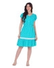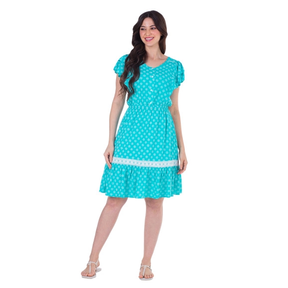 Vestido confeccionado em tecido plano, cintura com elástico interno, botões frontais fixos, detalhe em guipir e possui forro.
