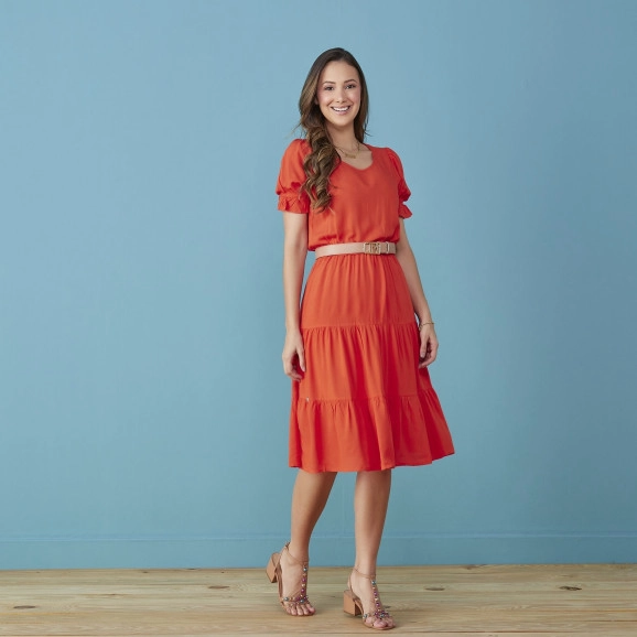 Vestido em Viscose Babados Laranja Tatá Martello confeccionado na viscose, decote em "V", manga curta com babado, saia três marias. OBS: cinto NÃO acompanha a peça. Composição: 100% Viscose.