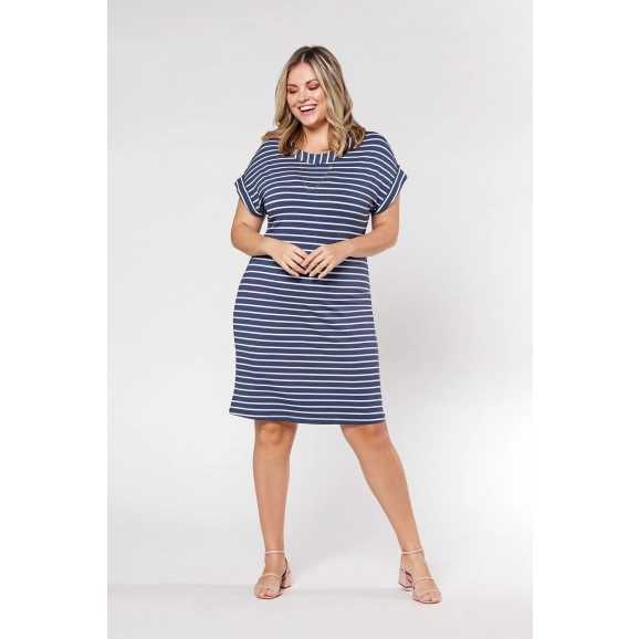 Vestido em viscose, soltinho, listrado, branco e azul. Composição: 76,4% Viscose, 4%Elastano, 16,6%Poliéster. Para quem não abre mão do conforto, essa é uma ótima opção!