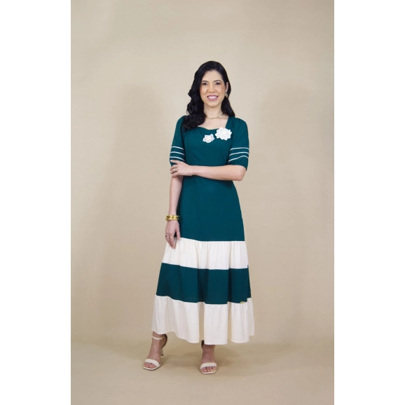 Vestido de comprimento longuete confeccionado em tecido com saia estruturada em recortes de marias bicolores. Apresenta modelagem com decote coração e mangas 7/8 detalhadas com franzido, elástico no punho e três listras decorativas. Destaque para o cós com sofisticadas aplicações de guipir (flores) removíveis, tingidas na cor complementar do design, conferindo versatilidade e acabamento premium à peça.