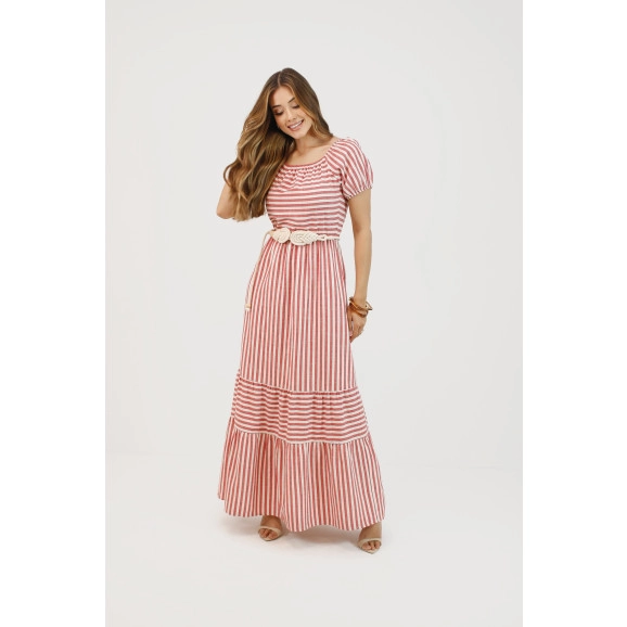Vestido Fabi Em Viscolinho Listrado Vermelho Nítido