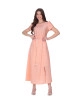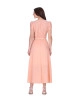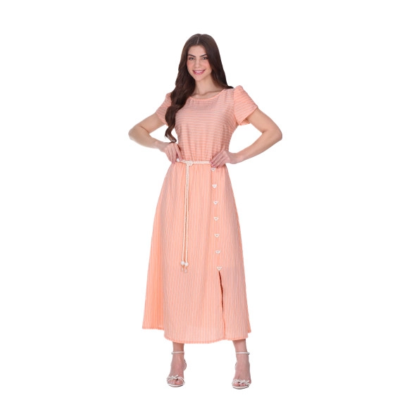 Vestido confeccionado em tecido plano anarruga listrado, decote redondo, ombro leve franzido, mangas duplas, elástico interno cintura, acompanha cordão, botões fixos, fenda frontal e possui forro.