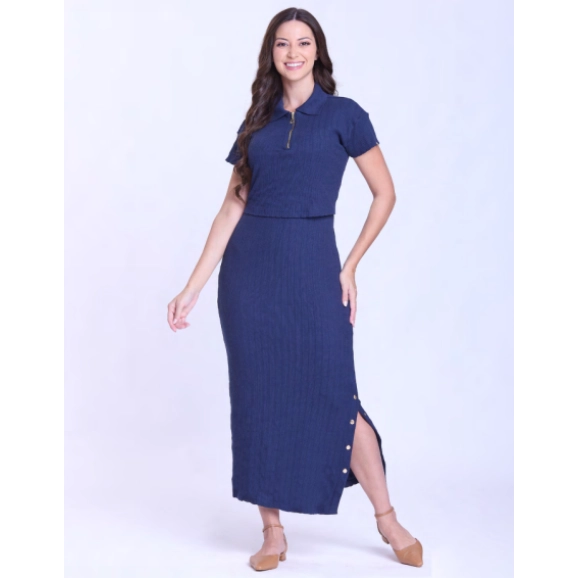Vestido em malha canelada, decote com gola e zíper de metal com pingente, blusa sobreposta, mangas curtas, botões de pressão na lateral da saia e possui forro.