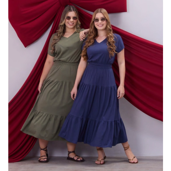 Vestido em malha de algodão, decote V, mangas curtas, elástico interno cintura e sem forro.