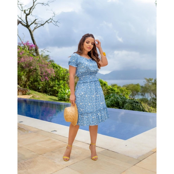 Vestido Floral Azul Celeste com Lastex na Cintura Boutique K