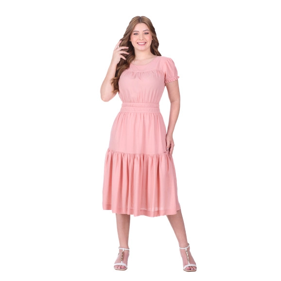 Vestido confeccionado em tecido plano, decote redondo, fechamento por botão no decote costas, mangas curtas com elástico interno e babado, elástico interno na cintura e possui forro.