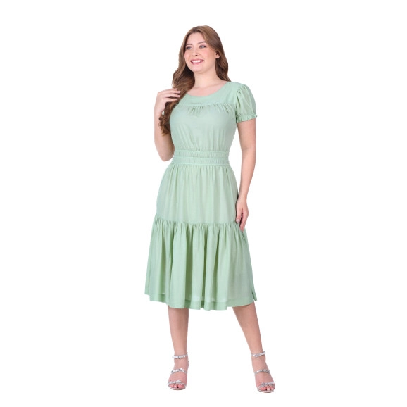 Vestido confeccionado em tecido plano, decote redondo, fechamento por botão no decote costas, mangas curtas com elástico interno e babado, elástico interno na cintura e possui forro.
