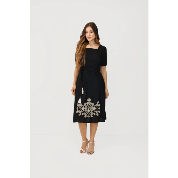 Vestido de linho com decote quadrado, manga princesa com elástico no punho comprimento midi e barra bordada. Acompanha faixa com barbicacho