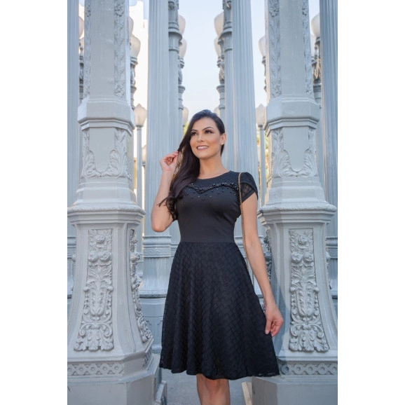 Detalhe: vestido godê com detalhes em tule, possui bordado em pedrarias. Aquele pretinho básico que não pode faltar no seu guarda-roupa!