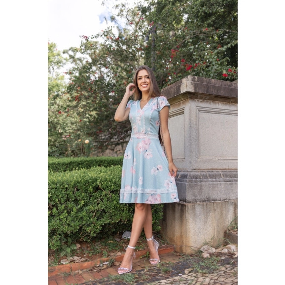 O Vestido Godê Detalhe Guiper Maria Amore possui gola v. Composição do tecido 92%poliester 8%elastano e forro 100%poliester. Vestido fofo, ideal para usar durante o dia!