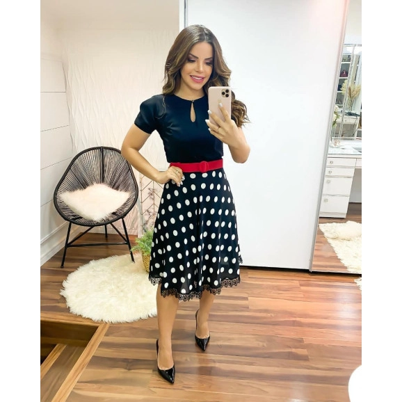 Vestido Godê Poá com Cinto Maria Amore, vestido de crepe barcelona com ceda, preto com poá. Vestido lindo, ideal para eventos mais chiques!