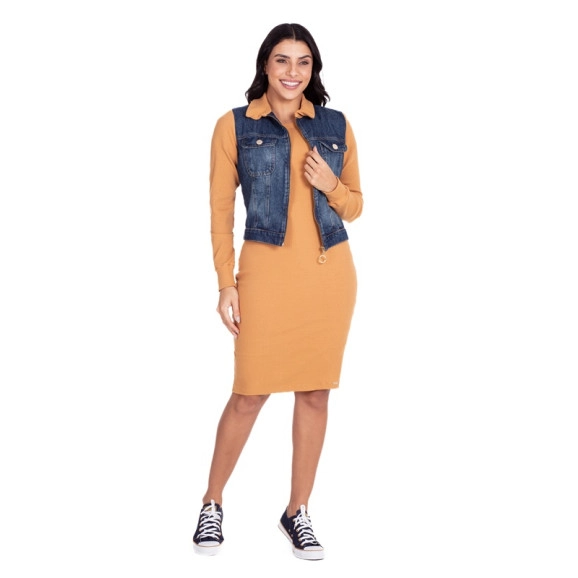 Vestido confeccionado em malha canelada e jaqueta em jeans e malha canelada. Vestido com shape justo, mangas curtas e possui forro. Jaqueta jeans com as mangas caneladas, fechamento frontal por zíper destacável e bolsos funcionais.