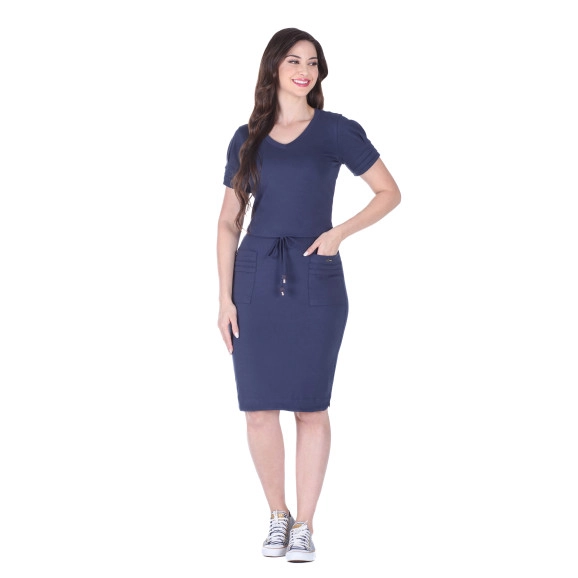 Vestido confeccionado em malha, detalhe em pregas nas mangas, bolsos funcionais, canaleta funcional na cintura e possui forro