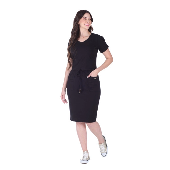 Vestido confeccionado em malha, detalhe em pregas nas mangas, bolsos funcionais, canaleta funcional na cintura e possui forro